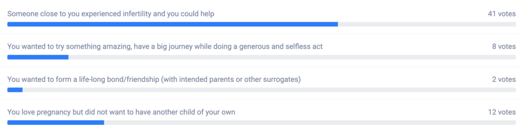 This week we asked our Surrogates to take a poll for Canadian Infertility Awareness Week, and 65% said that having someone close to them experience infertility / knowing that they could help build a family was what sparked their interest in surrogacy.